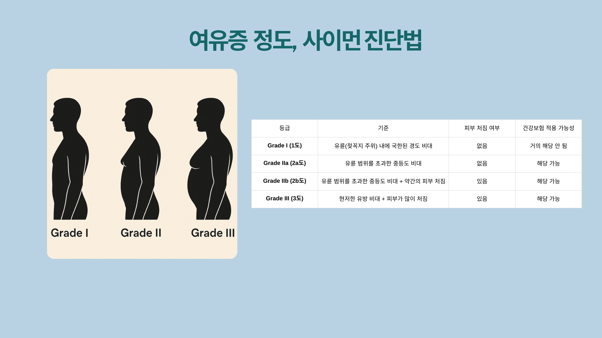 비용 부담으로 인해 수술을 망설이고 계신가요? 여유증은 특정 조건을 충족할 경우 건강보험 적용이 가능합니다. 건강보험 적용 기준은 사이먼 분류법 (Simon’s Classification) 에 따라 진단하여 지원 여부가 결정 됩니다. 자세한 내용은 의료 전문가와 상담하시는게 확실하고, 안전하기 때문에 병원 방문 전 참고가 필요한 분들께 도움이 되길 바라며 공유 드립니다.