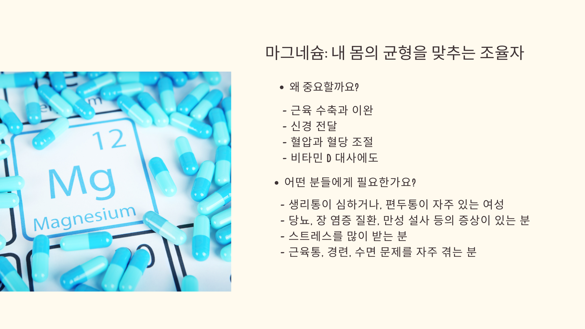 마그네슘이 부족하면 우리 몸의 균형이 살짝 어긋날 수 있어요.
